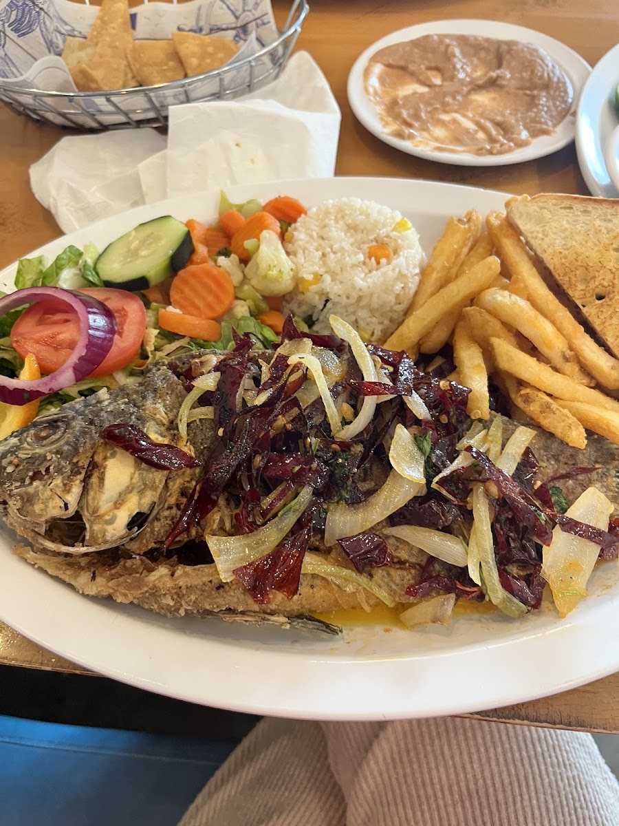 A signature dish at Villa Del Mar, Pulpo a la Diabla is a flavorful octopus dish cooked to perfection. This dish is served with rice, salad, fries, and toast, offering a well-rounded and satisfying meal. The bold flavors of the devilish sauce complement the tender octopus, creating a delightful dining experience that’s hard to beat.